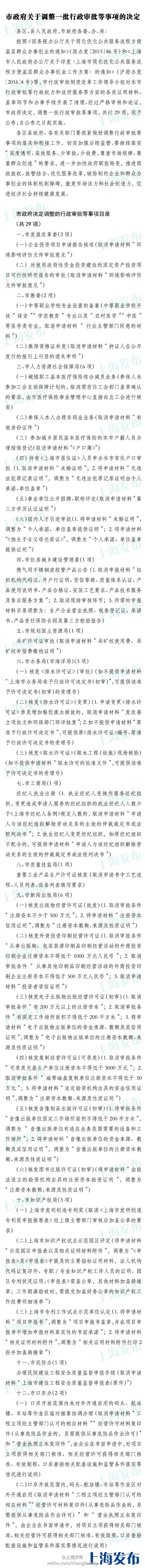 央廣網(wǎng)上海1月19日消息 據(jù)上海市政府新聞辦公室官方微博表示:經(jīng)過嚴(yán)格審核和論證,上海市政府決定調(diào)整29項行政審批等事項。包括:①參加城鄉(xiāng)居保的本市戶籍人員辦理續(xù)保時,取消申請材料“《戶口簿》”;②持有《上海市居住證》人員申辦本市常住戶口審批時,取消申請材料“未婚證明”、將申請材料“無違法犯罪記錄證明”,調(diào)整為“無違法犯罪記錄證明由個人承諾、單位蓋章”③事業(yè)單位公開招聘、職稱評定時,取消申請材料“第三方學(xué)歷認(rèn)證證明”等。