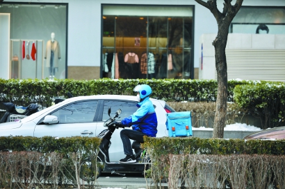 申城街頭隨處可見(jiàn)的外賣(mài)騎手。 鄔林樺 攝