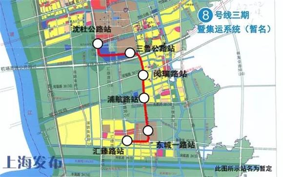 8號線三期自二期終點站沈杜公路站至匯臻路站,全長6.6公里,車站6座。目前車站已全部封頂。(8號線三期與以往軌道交通相比,有兩項主要創(chuàng)新,一是系統(tǒng)制式新:采用高度集成的APM膠輪路軌系統(tǒng);二是功能定位新:是中運量城市末端客流收集系統(tǒng),為大運量軌道交通系統(tǒng)的補充。主要功能是穿梭運營于閔行區(qū)浦江鎮(zhèn)區(qū)域,與8號線換乘接駁運營。因此8號線三期的線路命名將與上海既有軌道交通線路名稱有所不同,具體線名目前正在研究過程中。)