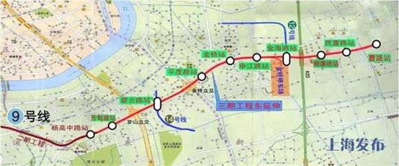 9號線三期東延伸(起自9號線二期工程終點楊高中路站,自西向東延伸,終點站曹路站),全長13.8公里、車站9座。目前全線結(jié)構(gòu)貫通,正在進行軌道鋪設(shè)和車站裝修安裝施工。