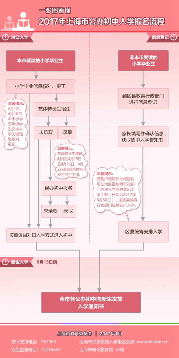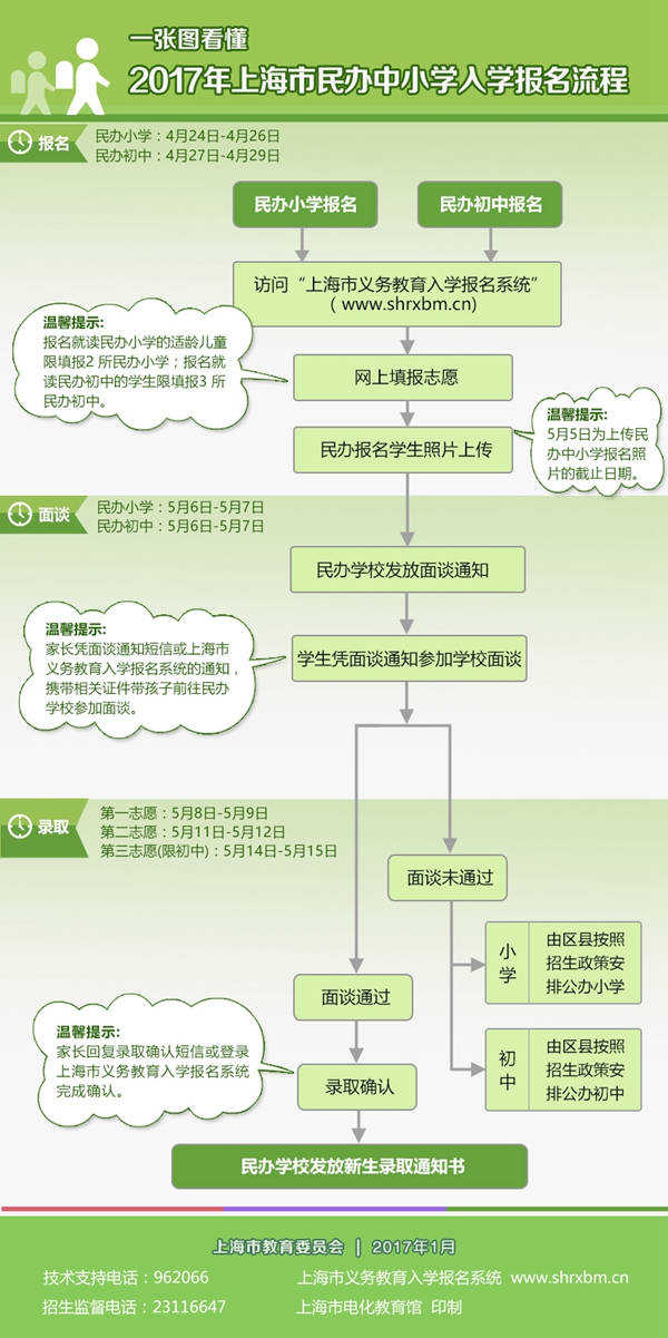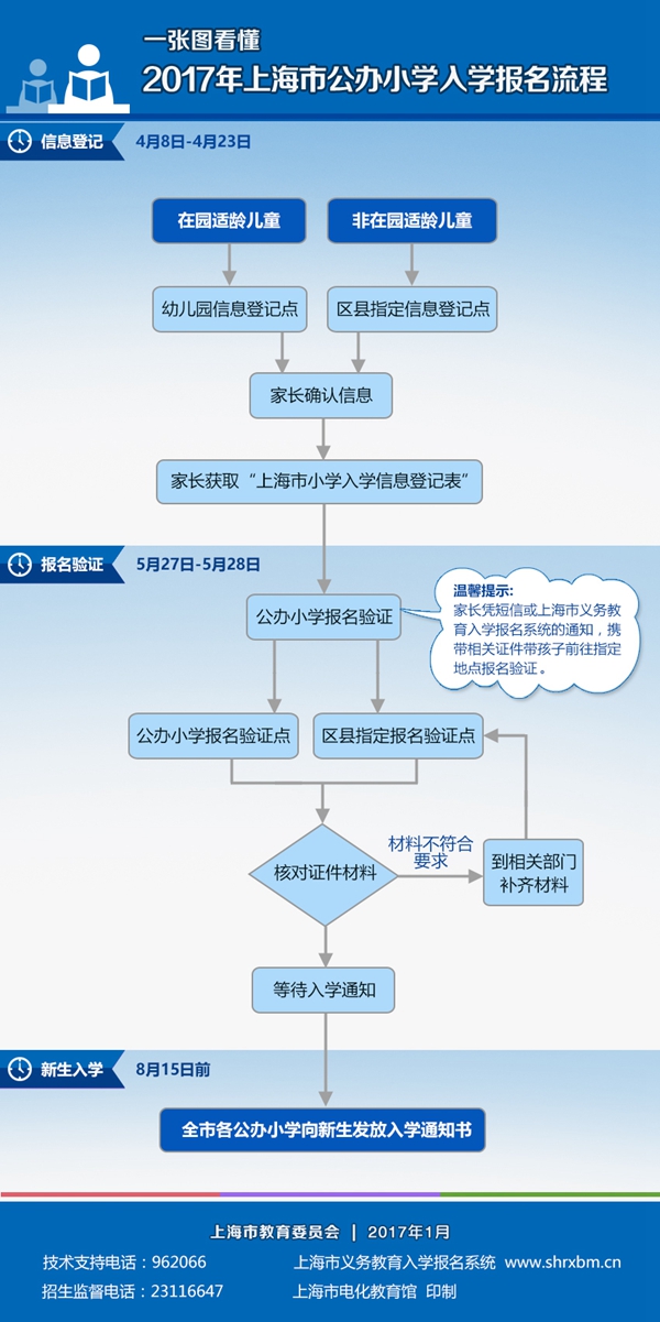 央廣網上海1月6日消息(記者吳善陽 唐奇云) 上海市教委日前公布《2017年本市義務教育階段學校招生入學工作的實施意見》,相關政策整體保持穩(wěn)定,同時另為學生家長附上本市公辦及民辦中小學入學報名流程圖解——