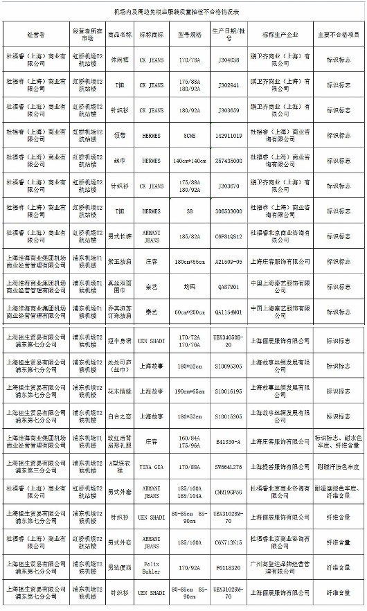 機場內及周邊免稅店銷售服裝的主要不合格項目是色牢度、纖維含量和標識標志。50個批次服裝經檢測,有22個批次不合格。