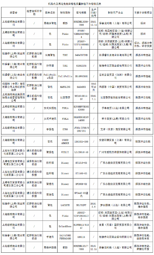 其中,虹橋機場T2候機樓內的杜福睿(上海)商業(yè)有限公司銷售的標稱由杜福睿北京商業(yè)咨詢有限公司生產(供貨)的“SALVATORE FERRAGAMO”牌手提包(型號規(guī)格:586115),其雙提把測試18次后,前身提把左側連接處金屬圈變形脫落、后身提把右側連接處金屬圈變形脫落;該公司銷售的另一款“TUMI”牌行李箱(型號規(guī)格:028821TG),拉桿測試300次后,發(fā)現(xiàn)拉合不順暢。
