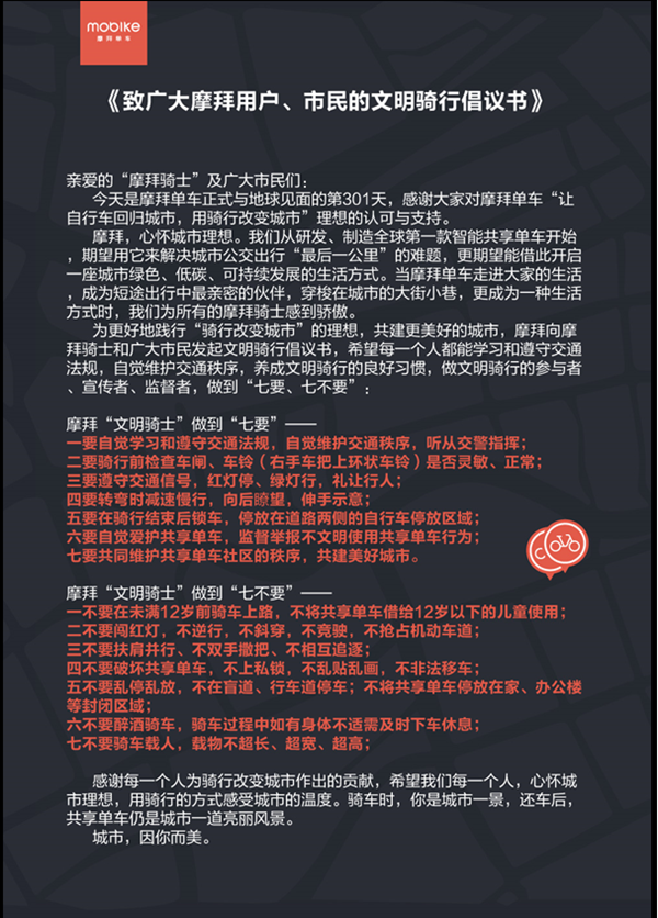 日前,共享單車行業(yè)的領(lǐng)導(dǎo)者摩拜單車發(fā)起全國(guó)首個(gè)文明騎行倡議活動(dòng),倡導(dǎo)廣大用戶和市民主動(dòng)學(xué)習(xí)和遵守本地交通規(guī)則,積極踐行文明騎行,自覺(jué)愛(ài)護(hù)共享單車,共同助力美好城市建設(shè)。