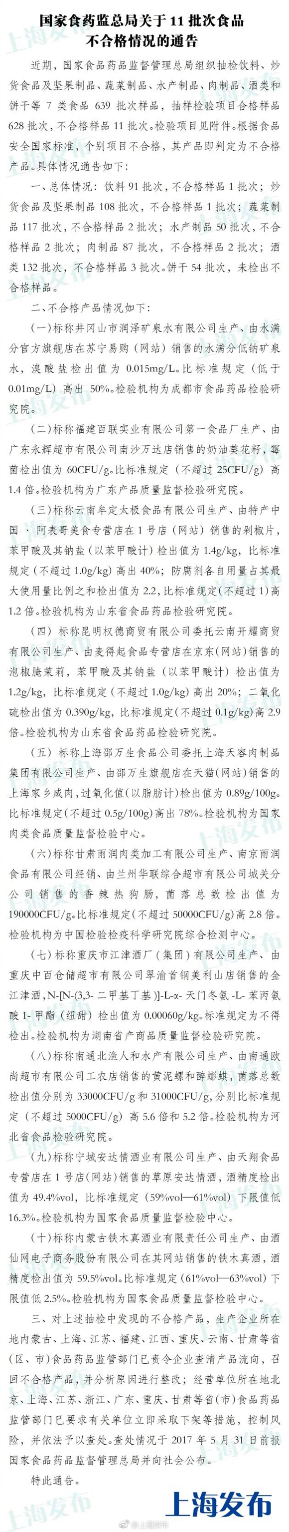 央廣網(wǎng)上海3月27日消息 據(jù)上海市政府新聞辦公室官方微博發(fā)布稱,國家食藥監(jiān)總局組織抽檢639批次食品,共11批次不合格,包括標(biāo)稱云南牟定太極食品有限公司生產(chǎn)、由特產(chǎn)中國·阿表哥美食專營店在1號店(網(wǎng)站)銷售的剁椒片,標(biāo)稱昆明權(quán)德商貿(mào)有限公司委托云南開耀商貿(mào)有限公司生產(chǎn)、由麥得起食品專營店在京東(網(wǎng)站)銷售的泡椒腌茉莉等,涉及防腐劑、二氧化硫、苯甲酸及其鈉鹽超標(biāo)等問題。