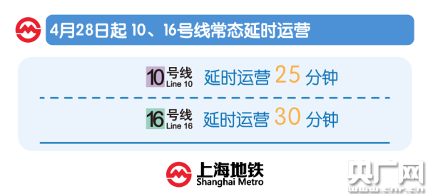 針對(duì)乘客集中反映的10、16號(hào)線末班車結(jié)束時(shí)間過(guò)早的問(wèn)題,地鐵運(yùn)營(yíng)方高度重視。4月28日起,10號(hào)線、16號(hào)線兩條線路全線每天都將延長(zhǎng)運(yùn)營(yíng)時(shí)間,10號(hào)線全線延時(shí)運(yùn)營(yíng)25分鐘,16號(hào)線全線延時(shí)運(yùn)營(yíng)30分鐘,延時(shí)運(yùn)營(yíng)期間的列車運(yùn)行間隔均為10分鐘左右。