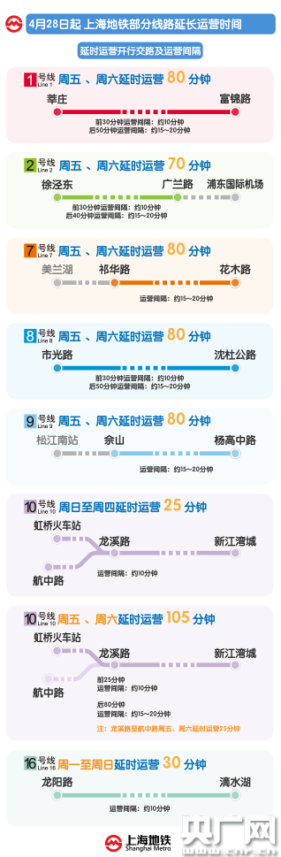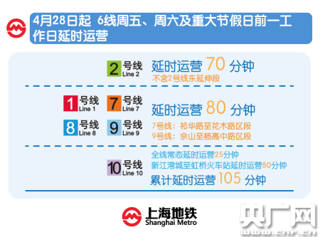 4月28日起,上海地鐵1、2、7、8、9、10號(hào)線實(shí)施周五、周六延時(shí)運(yùn)營(yíng)。在延長(zhǎng)運(yùn)營(yíng)時(shí)段內(nèi),上述線路均在原末班車后開(kāi)行載客列車,運(yùn)營(yíng)車站覆蓋中心城區(qū)(即外環(huán)線內(nèi)),開(kāi)行區(qū)段內(nèi)站站停靠;在延時(shí)運(yùn)營(yíng)時(shí)段內(nèi),上述線路均可在相關(guān)站點(diǎn)進(jìn)行換乘。