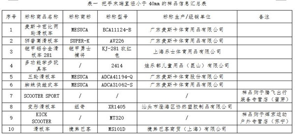 測試結(jié)果顯示,10件樣品把手末端直徑小于40mm把手橫管是兒童滑板車上較為明顯的突出部件,為避免滑板車在騎行中意外側(cè)翻時,把手砸傷使用者或第三者的腳面及身體其他部位,把手末端不應(yīng)太過尖細(xì)。標(biāo)準(zhǔn)要求,兒童滑板車把手末端的直徑不應(yīng)小于40mm。測試結(jié)果顯示,有10件樣品把手末端的直徑小于40mm(見表一)。