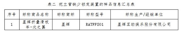 另有1件樣品把立管缺少鎖定裝置,5件樣品把立管強度不達(dá)標(biāo)。把立管作為兒童直接控制滑板車的部件,除了可調(diào)節(jié)高度、控制方向外,還承受著兒童部分體重,在特殊情況下還會承受更大的沖擊力或壓力。為避免意外坍塌,把立管應(yīng)當(dāng)有足夠的穩(wěn)定性和強度。標(biāo)準(zhǔn)要求,可調(diào)節(jié)高度的把立管如果不需要額外的工具調(diào)節(jié)高度,則至少要有兩個鎖定裝置,以防止高度的突然變化。測試中發(fā)現(xiàn),有1件樣品僅有一個自動鎖定裝置(見表二),沒有雙重鎖定。