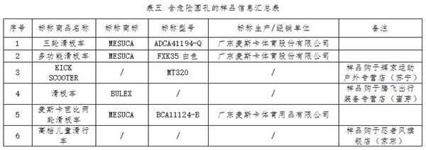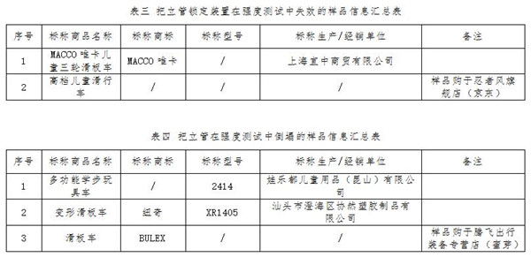 同時標(biāo)準(zhǔn)還要求,兒童滑板車不論其適用年齡大小、最大承重多少,把立管都要經(jīng)受垂直方向100kg持續(xù)5分鐘的強度測試,在測試中把立管不能倒塌、斷裂,鎖定裝置不能損壞或失效。結(jié)果顯示,有2件樣品的把立管鎖定裝置在強度測試中失效導(dǎo)致把立管向下塌縮(見表三),3件樣品的把立管在強度測試中彎折倒塌(見表四)。