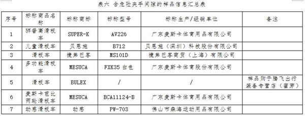 滑板車上活動最多的部件主要是車輪,車輪與車身支架之間均有一定間隙,這類間隙若與兒童手指粗細(xì)相當(dāng),則可能存在夾傷風(fēng)險。標(biāo)準(zhǔn)要求,兒童滑板車活動部件的可觸及間隙不應(yīng)在5-12mm之間。測試結(jié)果顯示,有7件樣品車輪周圍間隙在5-12mm之間(見表六)。
