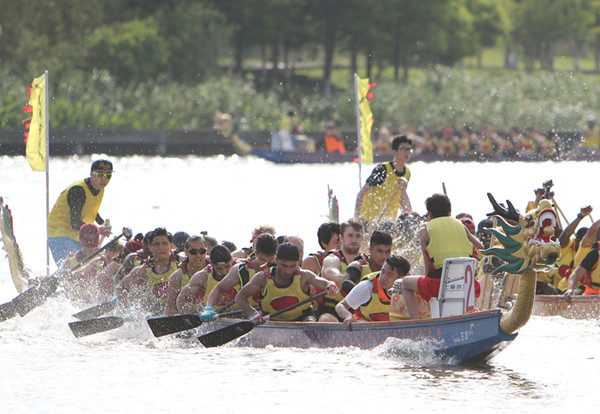 今年恰逢上海高校外國留學(xué)生龍舟賽十周年,現(xiàn)場競賽的氣勢格外威武和熱烈。經(jīng)過兩輪激烈角逐,華東師范大學(xué)隊摘得桂冠,東華大學(xué)隊和華東理工大學(xué)隊分獲第二、第三名。來自哈薩克斯坦的樂亞莉亞和阿馬恩,是華東理工大學(xué)生物工程專業(yè)的留學(xué)生,已是第三次參加龍舟比賽,在開賽前4周,他們每周要接受兩次的龍舟訓(xùn)練,他們表示,劃龍舟是具有中國特色的一項運動,參加這項賽事感覺非常有趣。