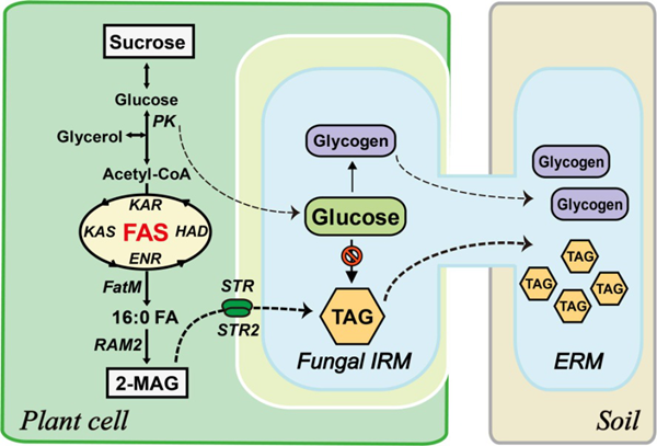 中國科學(xué)院上海植物生理生態(tài)研究所的王二濤團(tuán)隊(duì)通過穩(wěn)定同位素標(biāo)定實(shí)驗(yàn),首次否定了糖是植物傳遞給菌根真菌主要碳源形式。同時(shí),研究者采用遺傳學(xué),分子生物學(xué)及代謝生物學(xué)的手段研究發(fā)現(xiàn),植物宿主的脂肪酸合成對(duì)于叢枝菌根真菌共生是必須的,并且植物合成的脂肪酸能夠直接傳遞給菌根真菌。進(jìn)一步的研究發(fā)現(xiàn)植物基因合成的一類特殊脂肪酸分子,被植物的轉(zhuǎn)運(yùn)蛋白轉(zhuǎn)運(yùn)給菌根真菌。該研究系統(tǒng)揭示了脂肪酸是光合作用碳源的主要傳遞形式,推翻了傳統(tǒng)認(rèn)識(shí),對(duì)于理解生態(tài)系統(tǒng)的碳氮循環(huán)具有重要的意義。