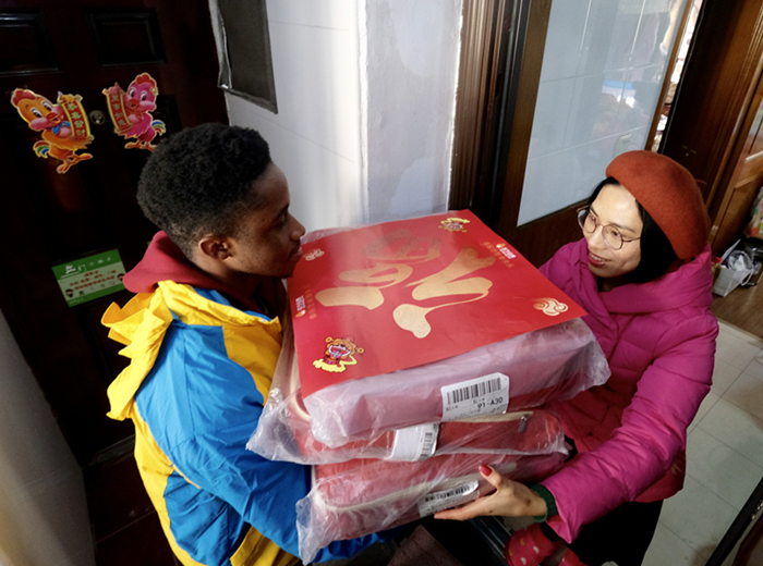 敲開收貨人家的門,上官女士驚喜地從上官手中接過了網(wǎng)購的床上用品。衛(wèi)默還給上官女士送上了一幅喜慶的春聯(lián),并用剛跟師傅學(xué)的上海話想上官女士送上新春祝!皟z好!祝您新年快樂!”