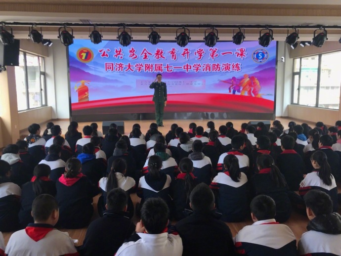 演習開始前,上海市公安局消防總隊的趙錦禎警官來到同濟大學附屬七一中學現場講解,與全體師生開展互動,向學生們教授了如何正確撥打“119”火警電話和火災后的自救自助演練。