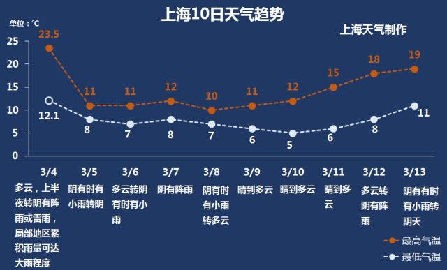 但是冷空氣迅猛抵滬,今天上半夜轉陰有陣雨或雷雨,局部累積雨量可達大雨。明天陰有時有小雨轉陰天,溫度將直線下降,最高溫僅11度。下周陣雨時常襲擾,最高溫維持在11度左右。