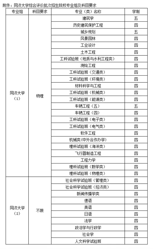 同濟大學(xué)綜合評價批次招生院校專業(yè)組及科目要求