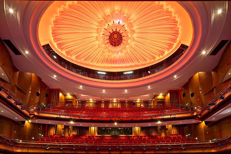在室內(nèi)設計上,采用了“風格性修復”的思路:正門大廳的大理石地坪上鑲嵌著半幅太陽花三星圖案,與建筑雙塔正立面圖案上下呼應,暗示著“中國大戲院”前身作為“三星大舞臺”的歷史文脈;各樓層休息廳的天花造型也延續(xù)了歷史遺存的天花風格,營造著歐式古典的空間感;而最為美倫美奐的當屬劇場觀眾廳穹頂,中心錯落有致的兩層共32瓣花瓣組成了一朵盛開的蓮花,在燈光的烘托下,高浮雕蓮花紋光影透疊,層次分明而又工整細膩,無處不彰顯這座富有歷史底蘊的劇院魅力。