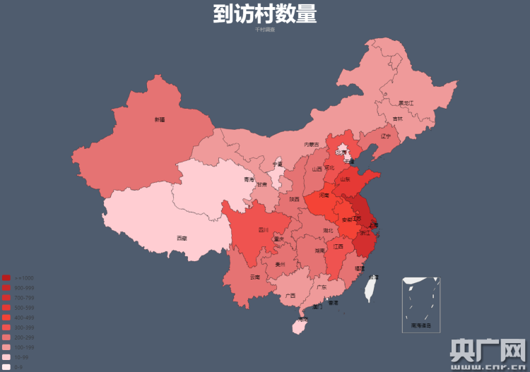 2008到2017年,上財(cái)師生累計(jì)在各省走訪村莊的分級(jí)顯示圖(顏色越深代表所到訪的村莊數(shù)量越多)