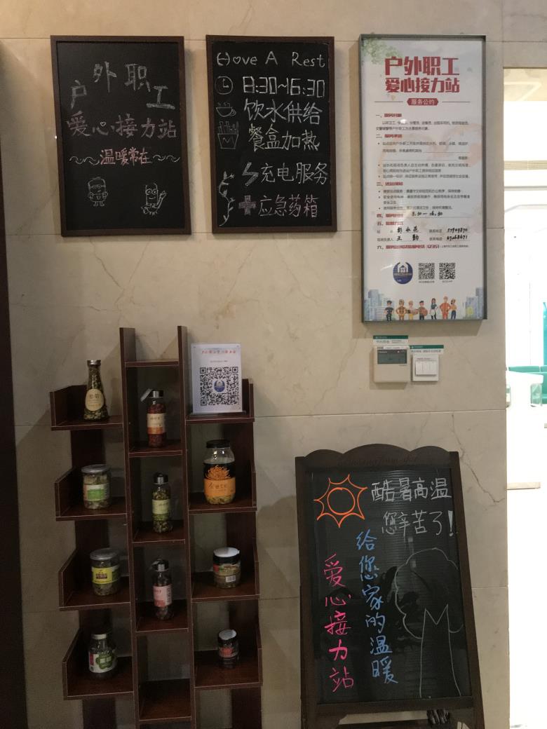 為給戶外工作者打造更加全面、便利、舒適的休息場(chǎng)所,農(nóng)行上海分行嚴(yán)格遵循“六有”標(biāo)準(zhǔn)設(shè)立及運(yùn)行愛心接力站,即:有場(chǎng)所、有標(biāo)識(shí)、有人員、有服務(wù)、有設(shè)施、有保障。麻雀雖小五臟俱全,在干凈整潔的網(wǎng)點(diǎn)一角,配備了空調(diào)、冰箱、微波爐、飲水機(jī)、充電排插、桌椅等6項(xiàng)基本設(shè)施。農(nóng)行的青年員工們還親手繪制了引導(dǎo)指示牌和溫馨提示,方便戶外工作者快速找到并使用愛心接力站的相關(guān)設(shè)施。農(nóng)行上海金山支行員工還集思廣益為設(shè)在支行營(yíng)業(yè)室的愛心接力站增配了免費(fèi)wifi、電視機(jī)、藥箱、書報(bào)架、各式茶飲、防暑降溫用品等個(gè)性化設(shè)施,實(shí)現(xiàn)了“6+X”的暖心配置。