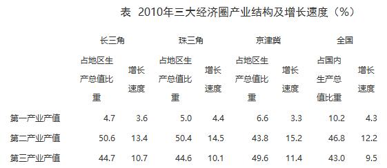 三大經(jīng)濟(jì)圈中,2010年三次產(chǎn)業(yè)增長(zhǎng)速度均超過(guò)全國(guó)平均水平的有幾個(gè)?