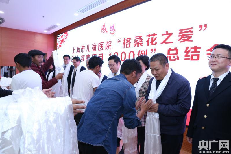 第38批藏區(qū)來滬患兒家屬為現(xiàn)場領(lǐng)導(dǎo)、嘉賓、醫(yī)務(wù)人員和愛心人士獻(xiàn)上潔白的哈達(dá)(央廣網(wǎng)發(fā) 上海市兒童醫(yī)院 供圖)