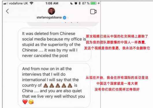 之后,有網友就涉嫌歧視一事與被稱為D&G設計師的Stefano Gabban在社交媒體上表達不滿,結果該設計師又曝出上述稱“中國才是‘*’的國家”辱華言論。