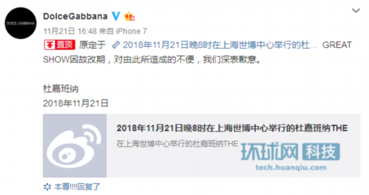 11日下午,D&G官方微博發(fā)文表示,原定于“2018年11月21日晚8時在上海世博中心舉行的SHOW”因故改期,對由此所造成的不便,我們深表歉意。