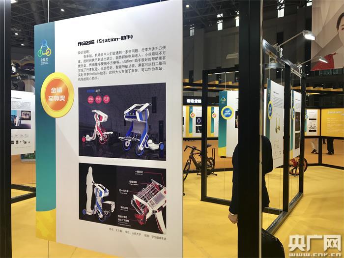 山西大學(xué)學(xué)生王文鑫設(shè)計(jì)的“Station-助手”獲得本屆大賽最高獎(jiǎng)項(xiàng)“金轅至尊獎(jiǎng)”。(央廣網(wǎng)記者 唐奇云 攝)