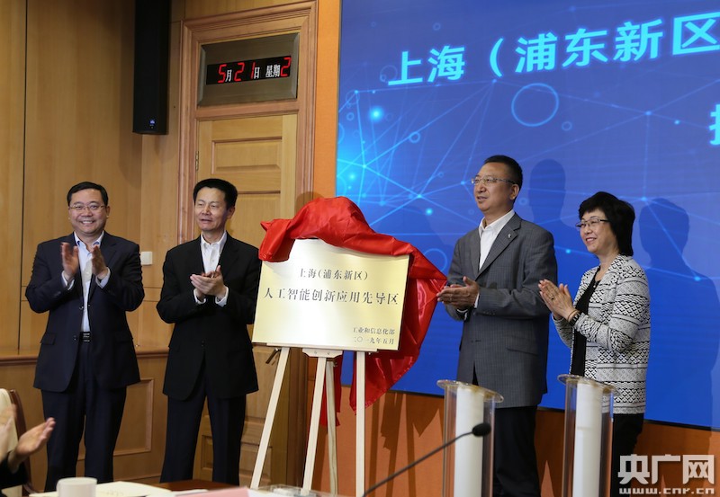工業(yè)和信息化部總經(jīng)濟師王新哲、上海市副市長吳清、工信部科技司司長胡燕、浦東新區(qū)常務(wù)副區(qū)長姬兆亮、出席并共同為“上海(浦東新區(qū))人工智能創(chuàng)新應(yīng)用先導(dǎo)區(qū)”揭牌。(央廣網(wǎng)發(fā) 上海市經(jīng)信委 供圖)