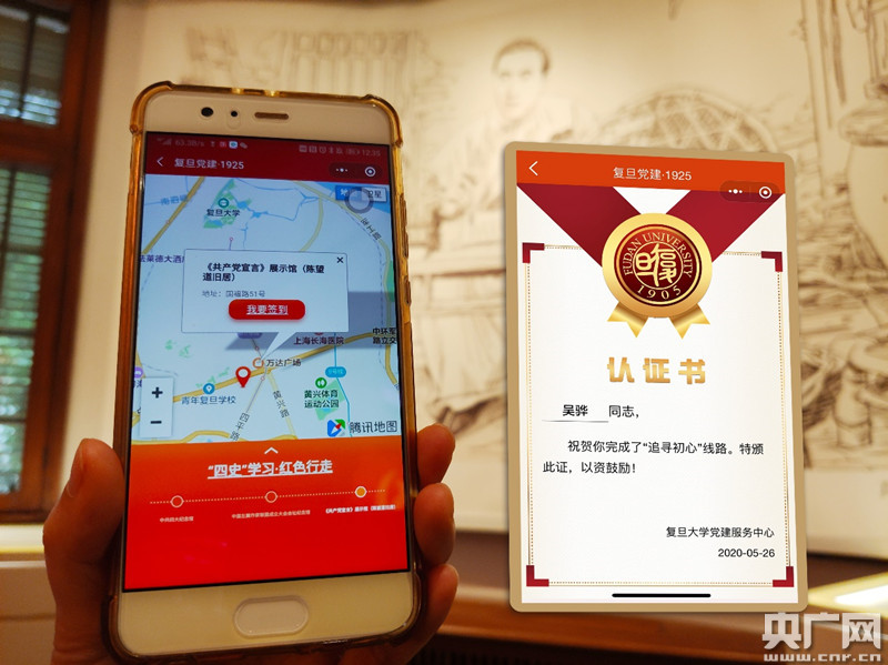 打開“復(fù)旦黨建·1925”微信小程序,全國黨建工作標(biāo)桿院系物理學(xué)系黨委書記吳驊在“定向活動”模塊看到了一條個性定制的紅色行走路線。路線顯示以《共產(chǎn)黨宣言》展示館為起點(diǎn),途徑中共一大會址紀(jì)念館,最終在中共二大會址紀(jì)念館完成行走。在相應(yīng)場館完成線下學(xué)習(xí)后,黨員們點(diǎn)擊“我要簽到”,即在線上成功打卡。完成路線上的所有打卡后,一張專屬的認(rèn)證書自動生成。