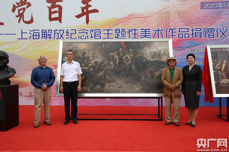 今年也是改陳后的上海解放紀(jì)念館重新開放一周年。在上海解放紀(jì)念館改陳過程中,上海海上油畫雕塑創(chuàng)作中心應(yīng)邀組織了多名優(yōu)秀藝術(shù)家圍繞上海解放革命史創(chuàng)作了六件美術(shù)作品,包括國畫《五前委》、雕像《胡文杰烈士》、浮雕《保衛(wèi)大上海》、油畫《寶山之戰(zhàn)》《郵電大樓之戰(zhàn)》《金融之戰(zhàn)》,現(xiàn)捐贈(zèng)給上海解放紀(jì)念館陳展并永久收藏。市文聯(lián)、市美協(xié)、長三角優(yōu)秀藝術(shù)家出席捐贈(zèng)儀式。