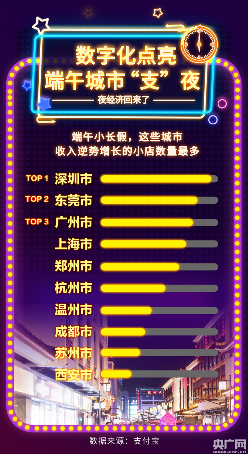 小店數(shù)字化程度越高的城市,夜經(jīng)濟越活躍。支付寶數(shù)據(jù)顯示,端午夜間,深圳、東莞、廣州、上海、鄭州、杭州、溫州、成都、蘇州、西安這十個城市收入逆勢增長的小店最多。