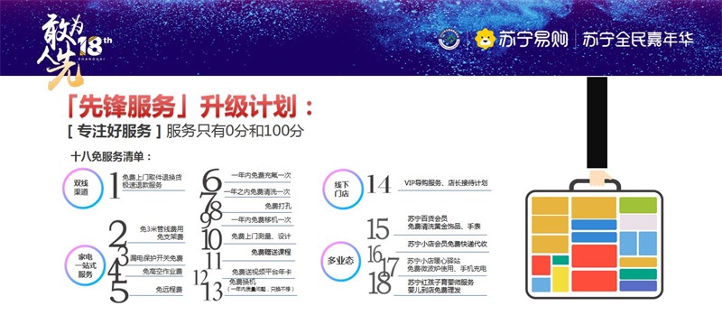 在上海地區(qū) ,蘇寧也為消費者“量身定制”了一套完整的、系統(tǒng)化、規(guī)范化的“十八免服務(wù)清單”,涵蓋家電、母嬰、百貨、快消等領(lǐng)域。