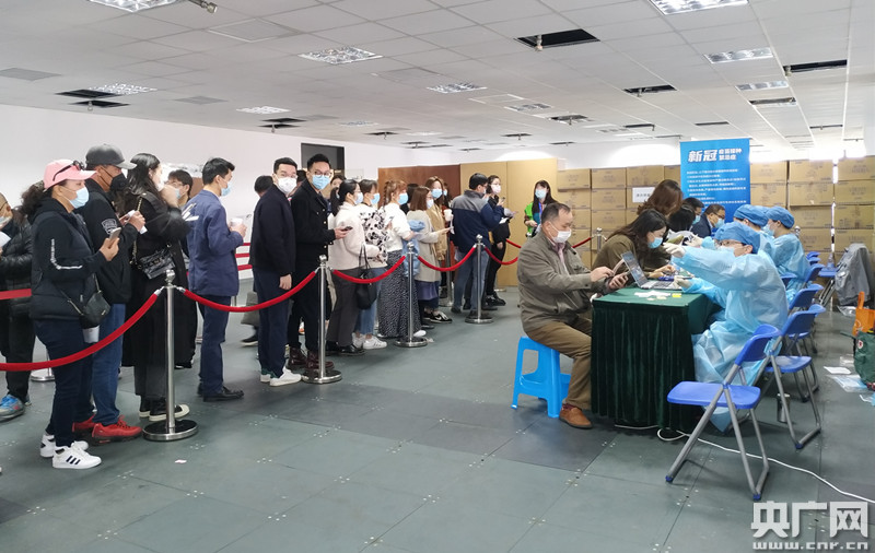 上海長寧區(qū)文廣大廈流動新冠疫苗接種點,前來接種的市民排隊進行預檢(央廣網記者林馥榆 攝)