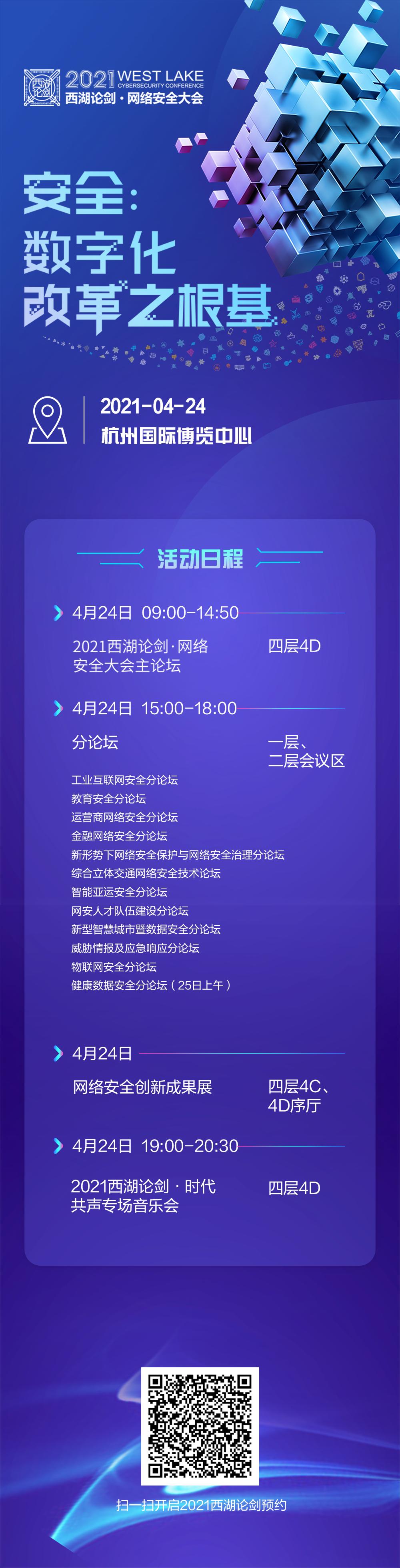 “十四五”開局之際,作為2021年國內(nèi)首場大型標(biāo)志性網(wǎng)絡(luò)安全線下大會(huì),緊抓數(shù)字化改革重要?dú)v史進(jìn)程,圍繞“安全:數(shù)字化改革之根基”這一主題,設(shè)立一場主論壇、十二場分論壇和一場網(wǎng)絡(luò)安全展覽。大會(huì)將于4月24日在杭州國際博覽中心舉行,屆時(shí)將進(jìn)行線上同步直播。