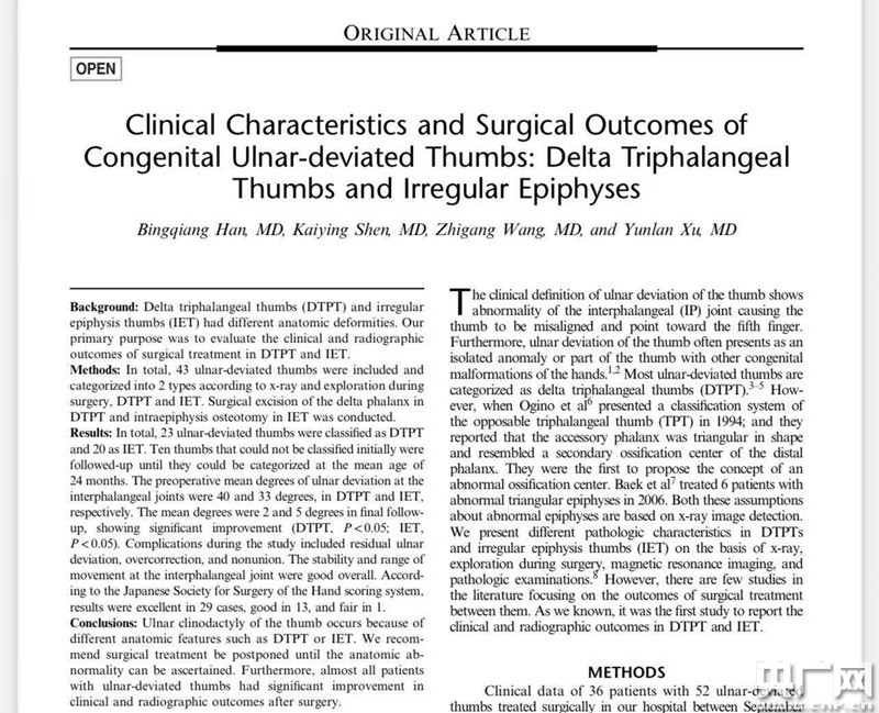 拇指在手部功能中占有舉足輕重的作用,拇指尺偏畸形并不少見,它給患兒及家長帶來極大的心理困擾,甚至造成兒童社交障礙;與此同時,尺偏的拇指無法完成捏、握、對掌等精細動作,影響生活質(zhì)量。手術(shù)切除“多余”指骨或行指間關(guān)節(jié)融合術(shù),術(shù)后雖然恢復(fù)了拇指力線,指間關(guān)節(jié)活動仍難以滿足日常生活需要,該畸形的治療仍然是小兒骨科界的一大難題。