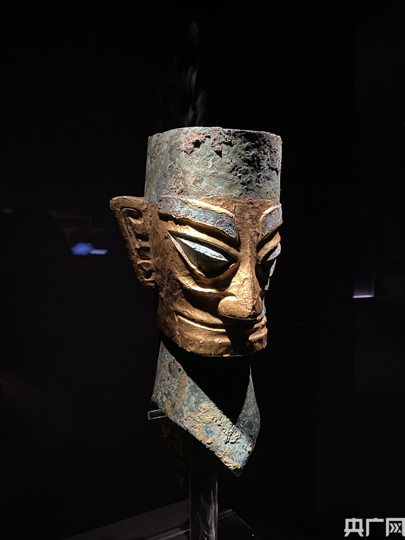 戴金面罩青銅人頭像(央廣網(wǎng)記者唐奇云 攝)