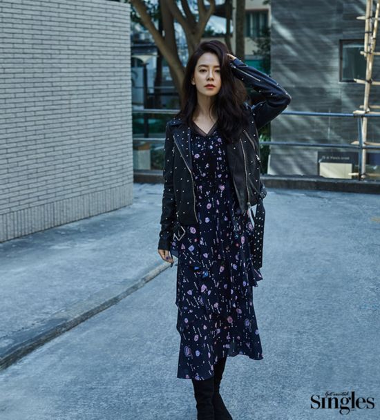 #宋智孝 #韓國演員 #《singles》 #花朵長裙 #紡紗群 #深藍色與花朵圖案 #花朵長款裙子與機車夾克 #黑色點綴