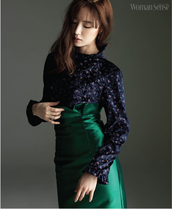 #徐智慧 #韓國演員 #《womansense》 #花朵圖案絲絨襯衣 #深藍與粉色 #綠色束腰半裙 #干練美 #職業(yè)裝