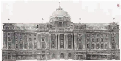 這一門難題近年既困擾海派新生代水墨畫家毛冬華,也驅(qū)動著她擔(dān)當(dāng)起上海畫家的使命。繪畫中,她施用了淡墨,但在淡墨中拉開墨色變化的層次,去組成畫面里建筑的整體美感。在展覽上,每幢外灘建筑以單體呈現(xiàn),不加任何背景,挑戰(zhàn)對水墨藝術(shù)規(guī)則。她把沒骨筆法視作一種放大了的寫意線條,因此有效地增添了石質(zhì)建筑的靈動性與鮮活感,而沒骨法的反復(fù)運(yùn)筆也呈現(xiàn)出厚樸與氤氳的積墨效果。這樣,從2014年至今,她以純水墨的方式全面呈現(xiàn)外灘從1號到33號共22幢歷史老建筑,這批水墨作品出現(xiàn)在劉海粟美術(shù)館《外灘心影——毛冬華水墨作品展》上。展覽持續(xù)至3月15日。