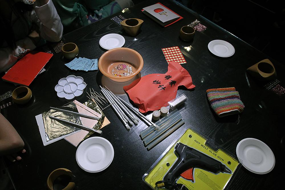 為了保證安全,課堂上使用了環(huán)保漆,工藝則是傳統(tǒng)的。先在打磨光滑的木質(zhì)手鐲上打上一層底漆,用吹風(fēng)機(jī)吹干,用金箔紙將木質(zhì)手鐲的每一部分都包裹住,在上面彩繪出自己喜歡的圖案,涂上保護(hù)層。在每張桌子上,都放著一個(gè)“錦囊妙計(jì)”,這是指導(dǎo)教師李莉特意設(shè)計(jì)的!靶∨笥岩鲆粋(gè)小時(shí),怕他們忘記步驟,可以打開錦囊妙計(jì)查看!背隋\囊外,李莉還特意要求孩子們盡量穿著傳統(tǒng)服飾,美術(shù)館課堂里,有人穿著旗袍,有人穿漢服,有的孩子還特意搭配了古典的發(fā)飾,煞是好看!捌崞魇欠沁z,也是中國傳統(tǒng)文化。穿著傳統(tǒng)服飾是為了讓他們做完后戴著手鐲留影,希望這能成為他們小學(xué)最后階段的美好回憶。”李莉說。