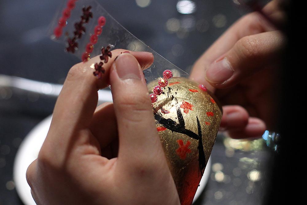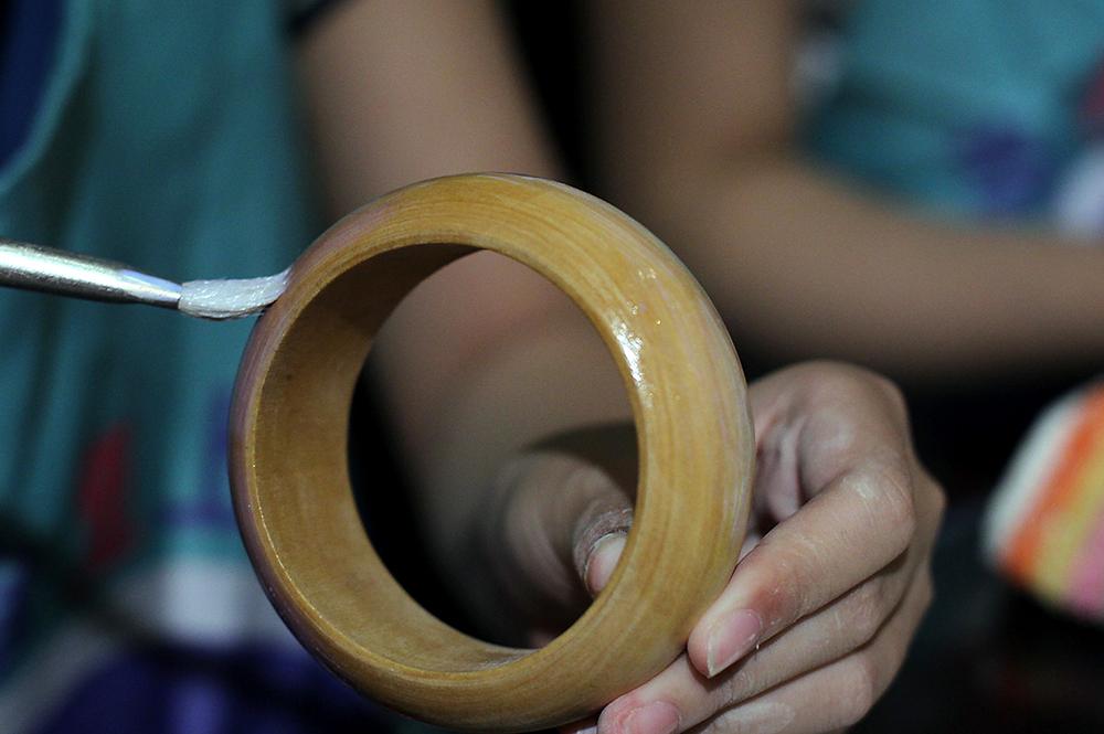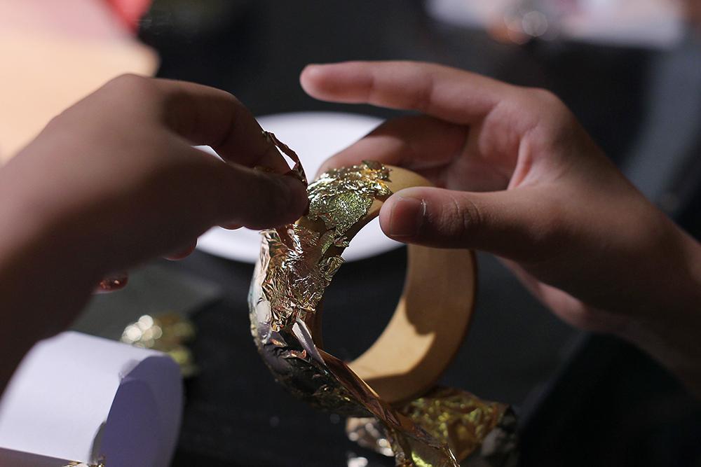 在中國歷史剛剛走出青銅器的神秘與凝重,而瓷器尚未成為萬眾矚目的“中國面孔”之前,漆器以其明艷絢麗的裝飾性和廣泛的實(shí)用性盛極一時(shí)。從秦漢的彩繪到唐代的螺鈿鑲嵌、金銀平脫,從宋元的剔犀、剔紅、戧金再到明清各種復(fù)合性制作工藝層出不窮,漆器的使用幾乎涵蓋了社會(huì)生活的方方面面。在“大漆司器——源于生活的漆器藝術(shù)展”中,除了漆器工藝品外,也有不少生活器具。項(xiàng)軍一邊看著孩子們往木手鐲上小心翼翼地貼金箔,一邊向解放日?qǐng)?bào)·上觀新聞?dòng)浾呓榻B,通過體驗(yàn)活動(dòng)希望孩子們能對(duì)漆器有一個(gè)基本認(rèn)識(shí),漆器和人們生活息息相關(guān),除了實(shí)用功能外,也可以做出各種藝術(shù)效果。