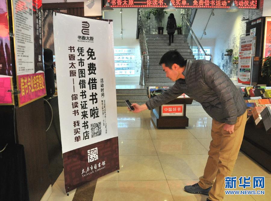 12月1日,一位讀者在掃描二維碼了解借書信息。在書店選中心儀的圖書,可直接把書借回家,不用花一分錢!這是由太原市文化局主辦的“你讀書、我買單”免費(fèi)借書活動。活動將從1日持續(xù)到10日,每天上午9時到11時,在太原書城和山西圖書大廈同步開展。新華社記者 王菲菲 攝