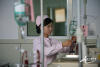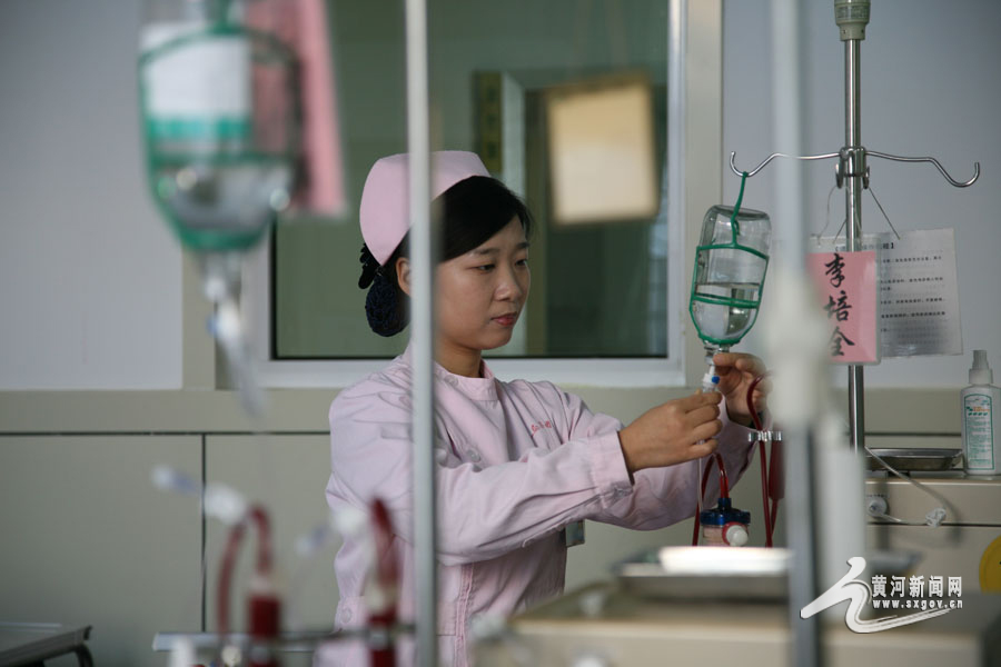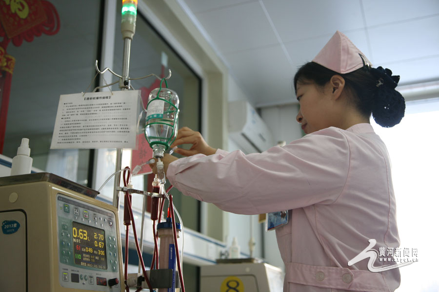 為上機(jī)患者檢查針口,與他們進(jìn)行細(xì)心的溝通交流 9點15分,記者跟隨護(hù)士來到一樓透析二室,病房門正對著一扇大窗戶,室內(nèi)光線充足。透析室有12張床位,賈媛媛為病人換藥時,擔(dān)心液體過快會影響病人的身體狀況,她會仔細(xì)觀察每個細(xì)節(jié),如:“注射口是否疼痛,注射針情況,病人血壓、血糖情況是否正常等”。 對于下機(jī)血糖低的患者,賈媛媛會及時給予血糖補充;對于下機(jī)身體腫脹不適的患者,她會親自按揉腿部,緩解患者的不適感;對于情緒不佳的患者,她會在提供專業(yè)護(hù)理的同時,更加側(cè)重于精神的鼓勵和心理開導(dǎo)。 -