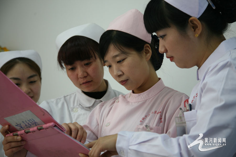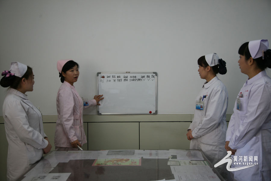 賈媛媛在辦公室為患者記錄醫(yī)囑。 10點12分,賈媛媛來到相關(guān)科室,與護(hù)士杜敏、林寶霞、王蓉蓉(上圖中從左到右)進(jìn)行護(hù)理會診,為一名聾啞患者研究個性化的護(hù)理治療方案。 -