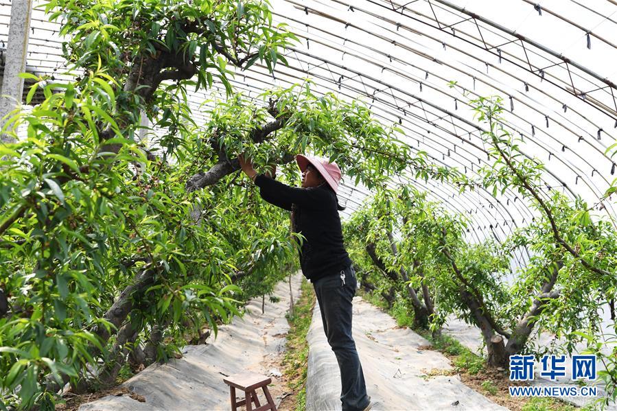 3月19日,在稷山縣清河鎮(zhèn)荊莊村的稷山縣愛民桃樹種植基地內(nèi),工作人員在管護油桃樹。