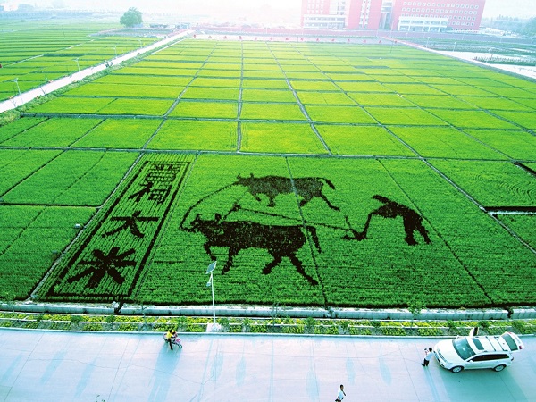 一幅稻田藝術(shù)畫亮相晉祠水稻公園,近日,一幅稻田藝術(shù)畫亮相晉祠水稻公園,碧綠的稻田中,兩頭健壯的“水!彪S稻穗飄蕩,栩栩如生,引得眾多游客嘖嘖稱奇。山西農(nóng)業(yè)大學(xué)董琦博士將農(nóng)業(yè)科學(xué)與美學(xué)藝術(shù)相結(jié)合創(chuàng)作設(shè)計了這一作品。(記者李全宏攝)