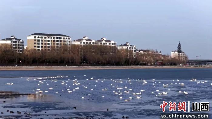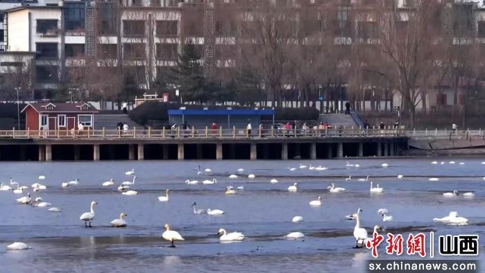飛臨公園的天鵝為初春的朔州增添了一抹靈動詩意(朔州市融媒體中心供圖)
