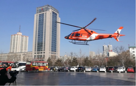 2月7日上午10時許,一架橘紅色空中救援直升機(jī)徐徐降落在太原市南宮廣場,醫(yī)務(wù)人員迅速將“車禍傷者”抬上直升機(jī)……